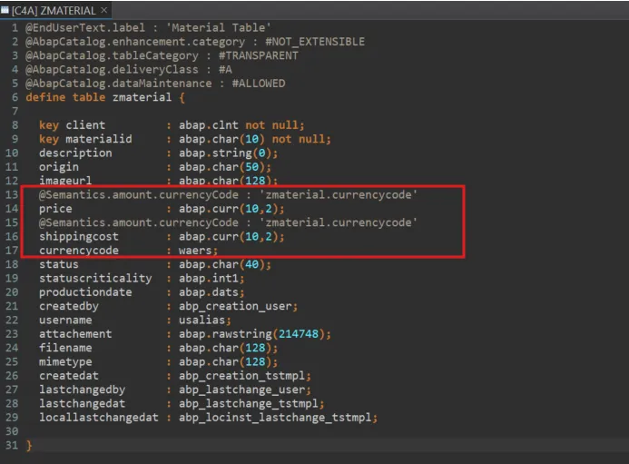 @Semantics.amount.currencyCode : 'zmaterial.currencycode'