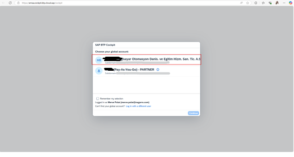 a.3.2. Joule entitlements’ı kuracağınız BTP Global Account’a gidiniz. Ardından Continue butonuna tıklayınız.