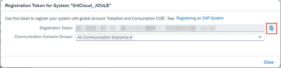 a.3.7. Registration Token değerini kopyalayın ve S/4HANA Cloud Public Edition Admininizle paylaşınız. Bu adımları yaptıktan sonra token kaydetme ekranını kapatabilrsiniz.