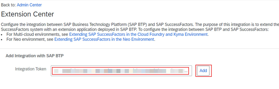 a.4.9. BTP admin’den aldığınız tokeni Integration Token alanına yapıştırınız. Add butonuna basınız. Aşağıdaki not önemli