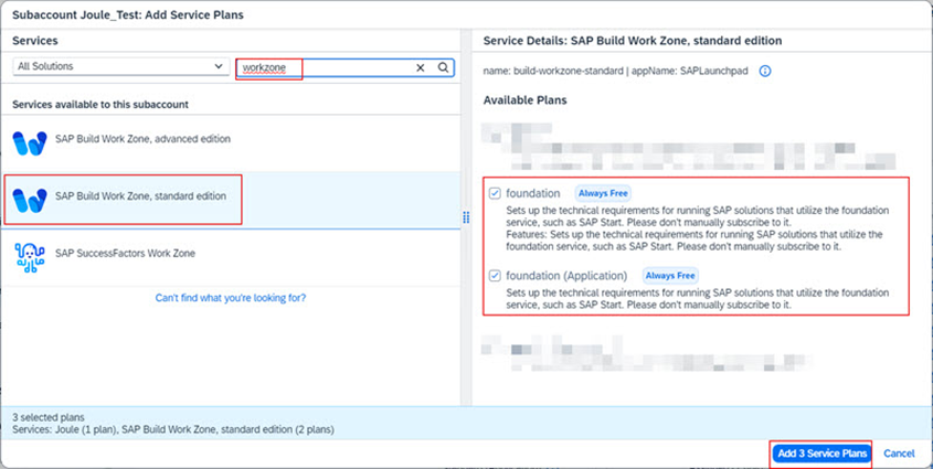b.2.4.Workzone”u aratın. SAP Build Work Zone, standard edition ‘a tıklayın ardından foundation ve foundation (Application) planlarını seçiniz. Add 3 Service Plans butonuna tıklayınız.