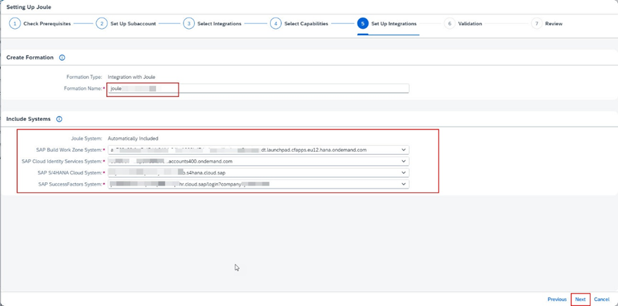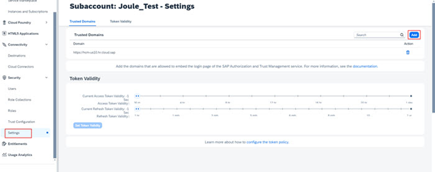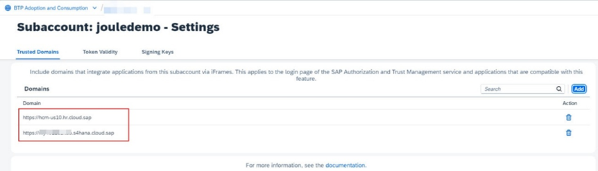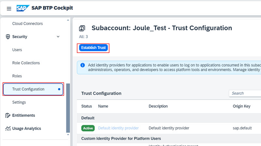 Note: Daha ayrıntılı bilgi için yine bu dokümanın hazırlık aşamasına bakın. Joule kurulumu için konfigüre edilecek olan tüm uygulamalar, aynı domain kullanılarak IAS ile entegre edilmelidir. Çoğu durumda, BTP subaccount trust’ını cloud.sap domainini kullanarak ayarlayın.