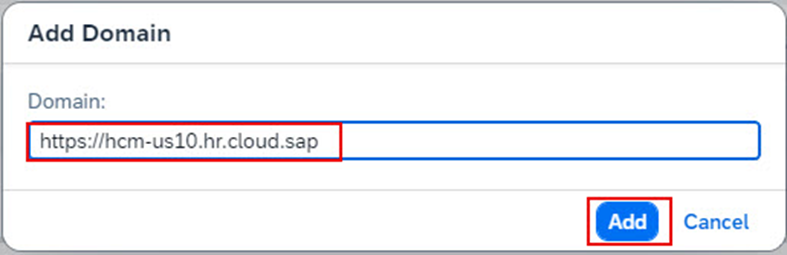 b.3.2. SuccessFactors tenant URL’nizi ekleyin ardından Add’e tıklayın. Örneğin; https://hcm-us10.hr.cloud.sap