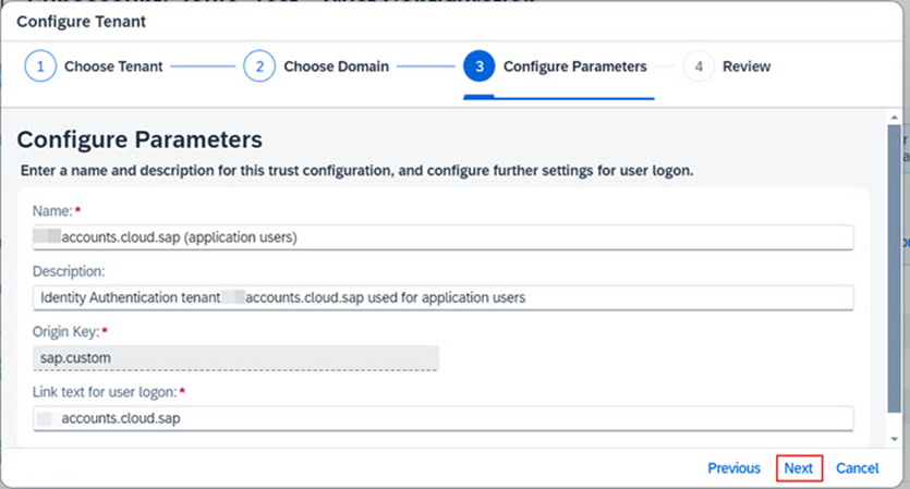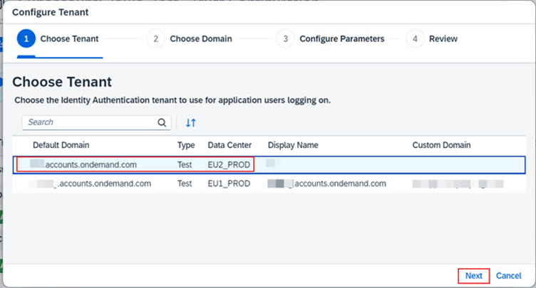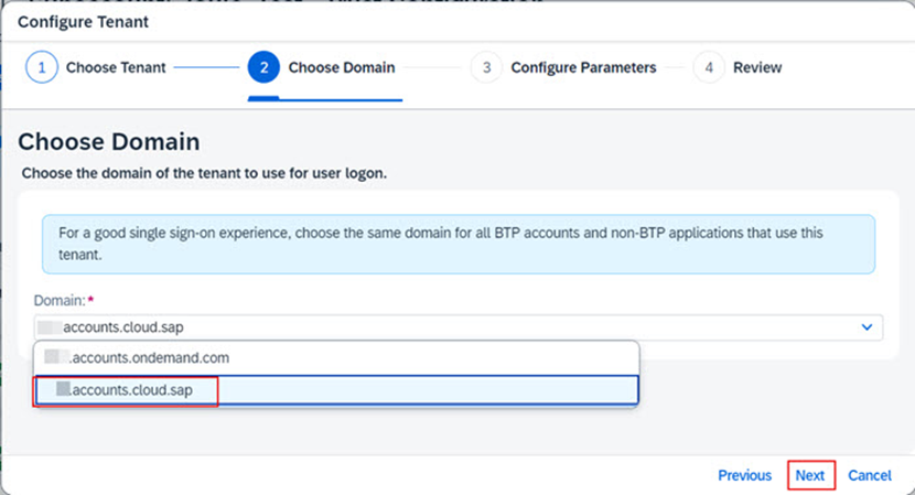 b.4.3. SAP Cloud Identity Services tenantınız için uygun domaini seçiniz. ias.accounts.ondemand.com ya da ias.accounts.cloud.sap seçeneklerinden birini seçiniz ardında Next’e tıklayınız.