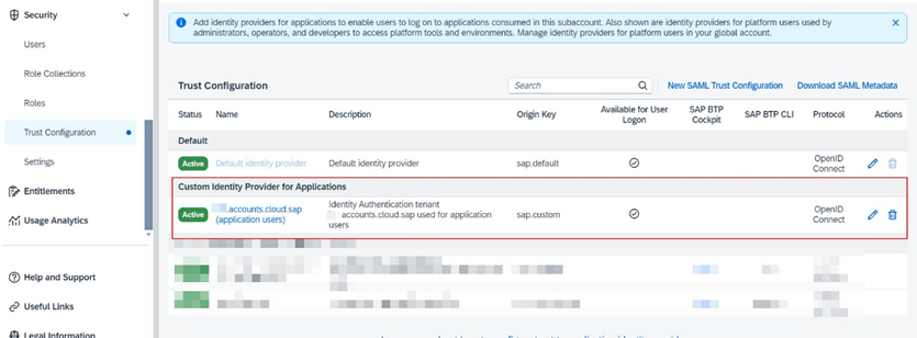 b.4.6. Custom Identity Provider for Applications altında yeni SAP Cloud Identity Services trust’ın görünür olduğunu doğrulayın.