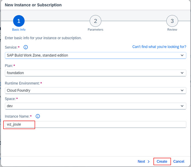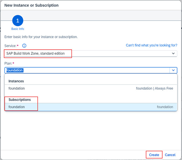 b.5.2. Service dropdown menüsünden SAP Build Work Zone, standard edition ‘ı seçiniz. Plan dropdown menüsünden Subscriptions >> foundation seçiniz. Create butonuna tıklayın.
