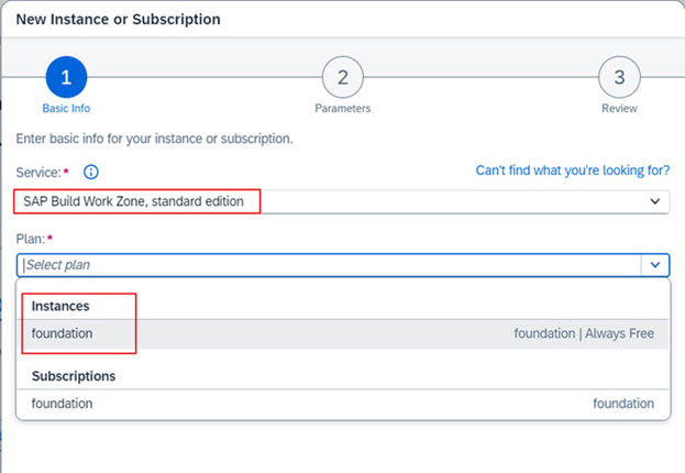 b.5.4. Service dropdown menüden SAP Build Work Zone, standard edition seçiniz. Plan dropdown menüden ise instances >> foundation seçiniz.
