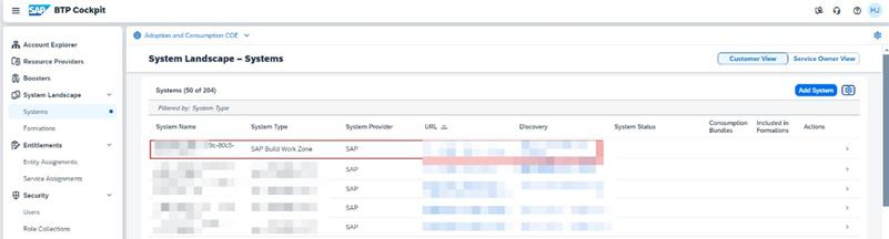 b.5.14. Şimdi System Landscape’in altında, SAP Build Work Zone tipinde kayıtlı yeni bir sistem görmeniz gerekmektedir. Bu sistem, daha önce oluşturmuş olduğumuz SAP Build Work Zone subscription’dan otomatik gelerek System Landscape ‘e eklenmiştir.