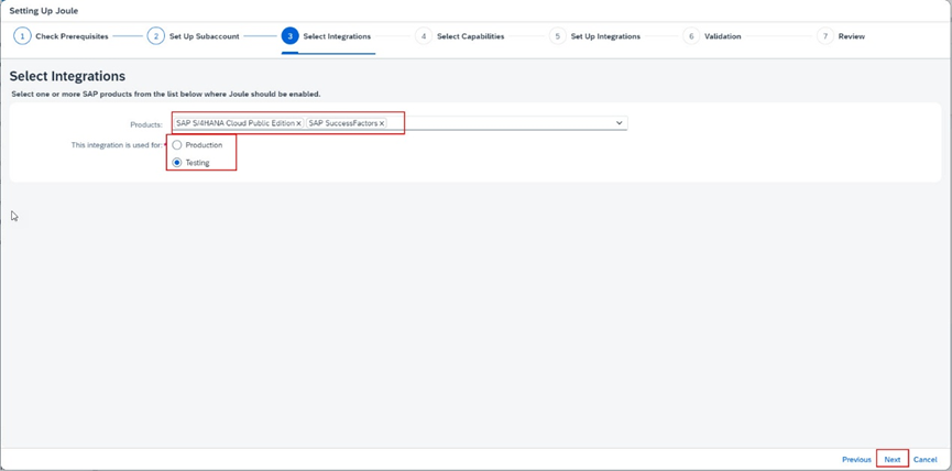 b.6.5. Products menüsünden Joule’u kullanmak istediğiniz tüm uygulamalarınızı seçiniz. Örneğin; SAP S/4HANA Cloud Public Edition ve SAP SuccessFactors. Daha sonrasında, entegrasyonun test için mi yoksa prodüksiyon için mi olduğunu seçiniz à Testing/Production. En sonunda Next’e tıklayınız.
