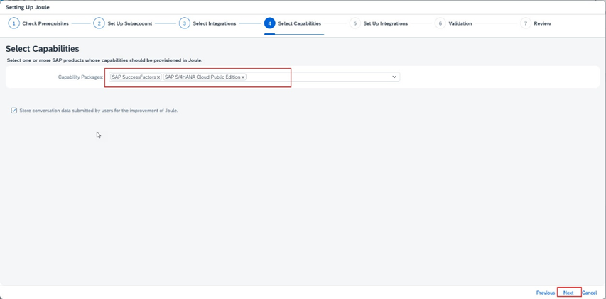 b.6.6. Bir önceki adımda seçtiğiniz uygulamalarınızın “Capability Packages” menüsünün altında listenmiş olduğunu doğrulayınız. Next.