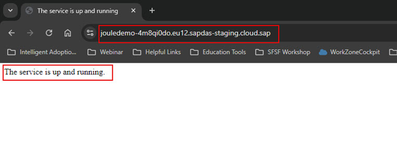 4. Joule uygulamasının çalıştığını teyit ediniz ve URL ‘yi bir kenara not ediniz. Çünkü bu URL, sonraki aşamalarda S/4HANA Cloud Public Edition gibi uygulamalarda Joule kurulumu için gerekli olacak.