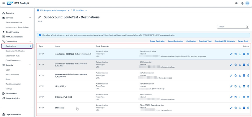 b.7.2. Joule Aboneliğini kontrol edin Destinasyonları kontrol ediniz (Check Joule Subscription and Destinations setup in BTP Subaccount)
