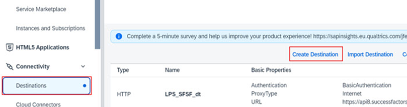 5. Connectivity >>Destinations’a gidiniz ve destinasyonların (destinations) başarılı bir şekilde yaratıldığını onaylayınız. Gösterilen destinasyonlar, booster çalıştırılırken seçilen sistemlere bağlı olarak değişecektir. Booster S/4HANA Cloud Public Edition ve SAP SuccessFactors için çalıştırılmışsa, ilgili destinasyonlar için aşağıdaki ekran görüntüsüne bakın.