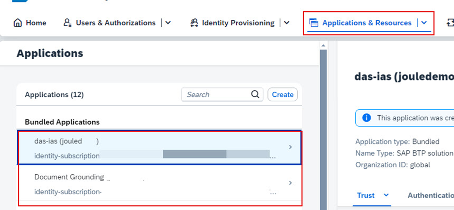 Hem das-ias hem de Document Grounding uygulamalarının SAP Cloud Identity Services’ta oluşturulduğunu doğrulayın. Bunlar Joule Booster tarafından otomatik olarak oluşturulur. Uygulama adlarının alt hesap adınızı da parantez içinde içereceğini unutmayın.