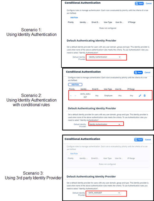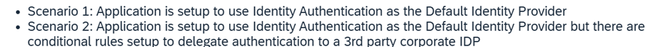 • Senaryo 2: Uygulama, Varsayılan Kimlik Sağlayıcı olarak Kimlik Doğrulama kullanacak şekilde ayarlanmıştır, ancak kimlik doğrulamasını üçüncü taraf bir kurumsal Kimlik Sağlayıcısına (IDP) devretmek için koşullu kurallar ayarlanmıştır.