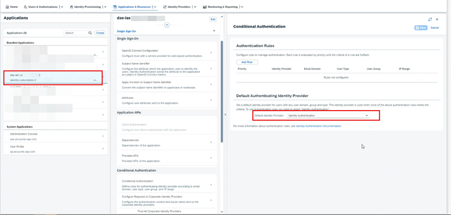 NOT: Booster tarafından oluşturulan das-ias (Subaccount’unuzun adı) uygulamasına geçin. Bu uygulama için Koşullu Kimlik Doğrulama (Conditional Authentication) ayarlarını, Joule’un yapılandırıldığı uygulama için ayarlanan ayarlarla tam olarak eşleşecek şekilde ayarlayın. Örneğin, SuccessFactors uygulaması Senaryo 3 ile kurulmuşsa, bu uygulamada Varsayılan Kimlik Sağlayıcısını da buna göre değiştirmeniz gerekir.