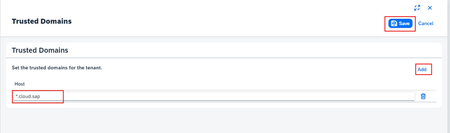 Gerekirse, uygulamanızın/uygulamalarınızın domainini eklemek için Add’ e ardından Save‘e tıklayın. Örneğin SuccessFactors tenantınızın URL’si <–https://hcm-us10.hr.cloud.sap/login?company=yourcompany –> ve S/4HANA