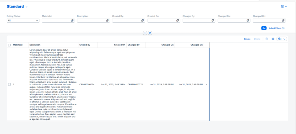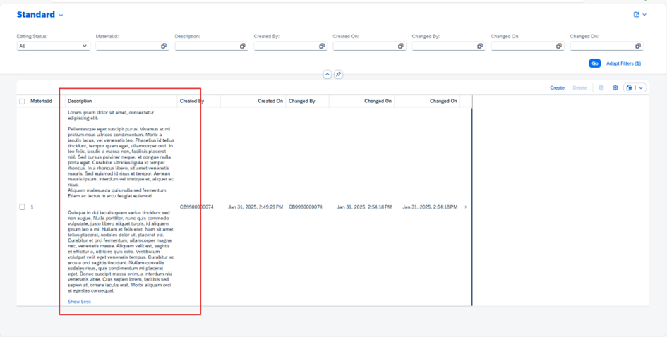 Örneğin; Sadece materialid ve description alanlarından oluşan bir uygulamada, multiLineText annotasyonu kullanılmadan önce yazmış olduğumuz 2 paragraflık metin aşağıdaki gibi (paragraf boşluğu dahi bırakmaya izin vermiyor) gözükmektedir.