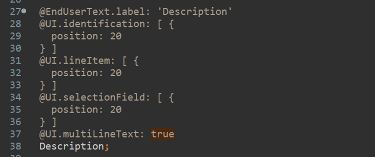Şimdi de Metadata Extension dosyasında @UI.multiLineText: true annotasyonu kullanacağız.